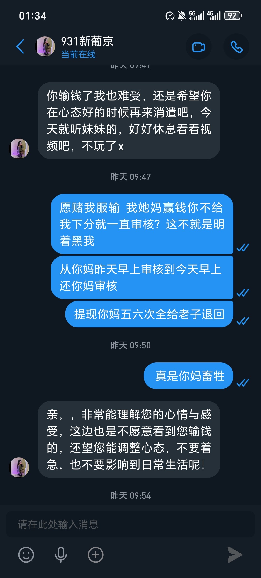 死妈931黑台上500裸打下2000卡两天 下了五六次 问就是注单异常审核中  输到剩500只下本金都不给下  输完今天活动送的几十下200都不给下 依旧注单异常审核 真鸡巴牛掰   这个台玩了两个月赢了差不多两万吧之前下分都是几分钟就到账  现在直接开黑一毛都不给下