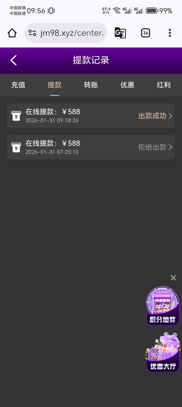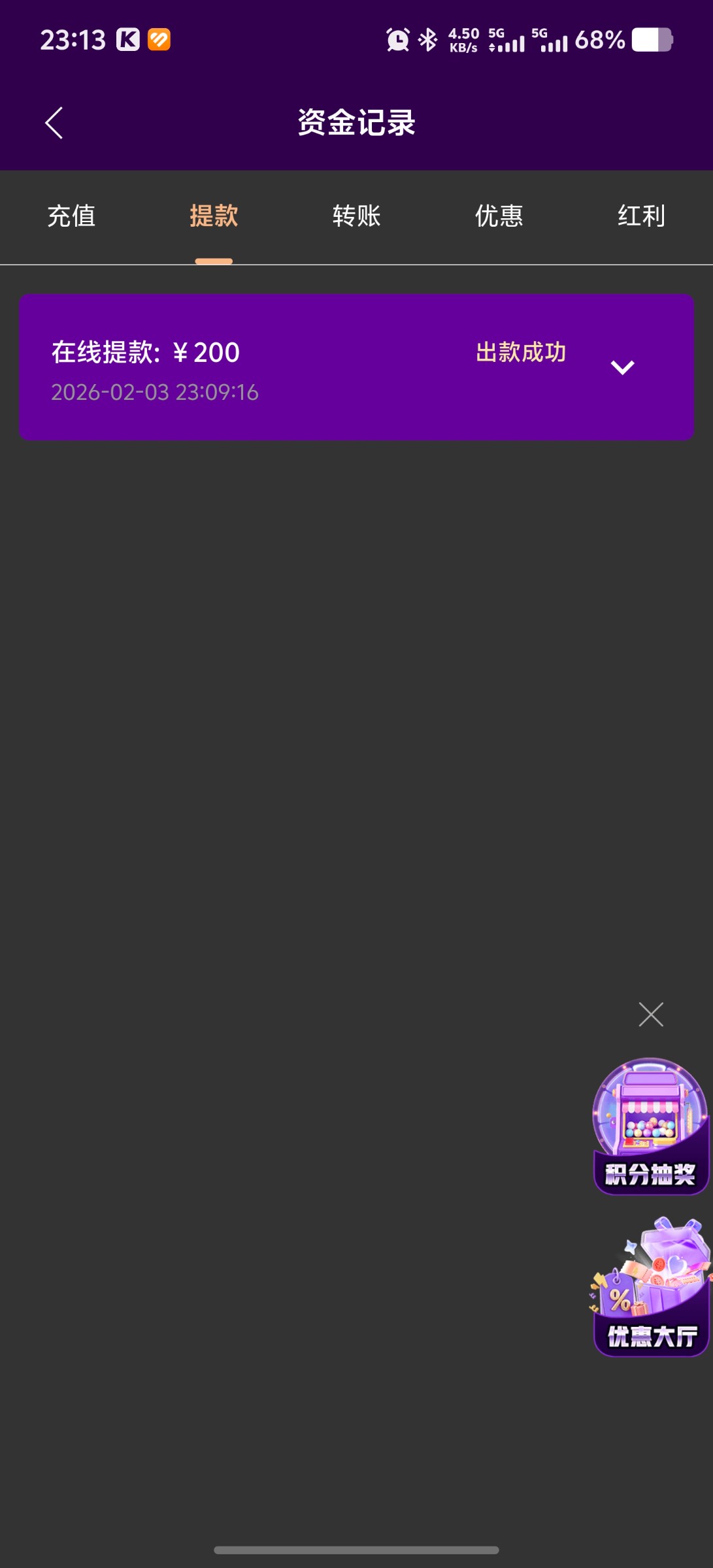 代码自助38元,8水,完成要求需要存款100(不可参与其他优惠),最多提款200元,具体规则自己看图。不喜欢可以不要。【代码可以先兑换,左上角点击彩金商场自助兑换】